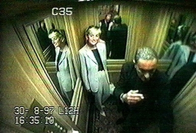This image made available Wednesday Oct. 3, 2007, from evidence presented at the inquest into the death of Diana Princess of Wales and Dodi Al Fayed is made from CCTV footage showing Diana, Princess of Wales with Dodi Fayed in the lift at the Ritz Hotel the afternoon before they both died. A man testifying at an inquest Monday, Nov. 12, 2007 described holding Princess Diana's hand as she repeated 'My God, my God' moments after her car crashed in Paris, Aug. 31, 1997. [Agencies]