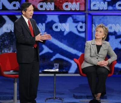 Representative Dennis Kucinich (D-OH), left, gestures as Senator Hillary Clinton (D-NY) listens at the CNN/Nevada Democratic Party debate at the University of Nevada Las Vegas, November 15, 2007. [Agencies]