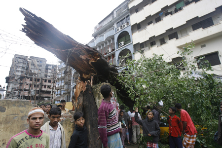 People gather around a fallen tree after a storm in Dhaka November 16,2007. [Agencies]