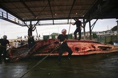 Updated: 2007-11-18 14:24 WADA, Japan - A whale's bleeding carcass bobbed in the surf, a steel harpoon jutting from its side. Then butchers at this Japanese fishing village went to work, turning a motorized winch to haul the beast ashore. On the flensing floor, the men blessed it with rice wine -- then hacked through blubber and sinew with long-handled knives, slicing vermilion flesh from the massive spine. Blood gushed from the 30-foot Baird's beaked whale like water from a hydrant.