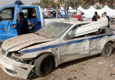A police car damaged in a suicide car bomb attack is seen in front of a courthouse in Ramadi, 115 kilometers (70 miles) west of Baghdad, Iraq, Wednesday, Nov. 21, 2007. A suicide car bomb exploded Wednesday at an Iraqi police checkpoint guarding the courthouse in Ramadi, wounding six people in the largest attack on Anbar province's capital in months, police said. [Agencies]