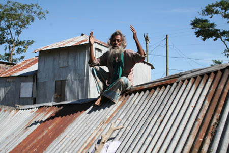 An old man prays on his house damaged by cyclone in Barguna district, 300 km south of Dhaka on Nov. 19, 2007. [Xinhua]