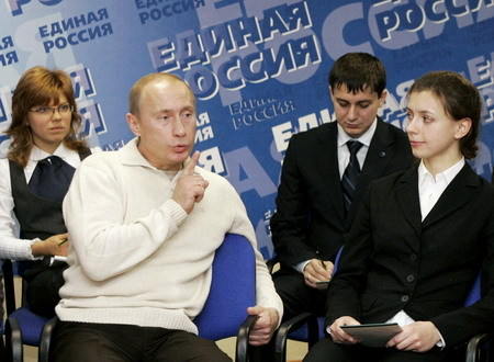 Russian President Vladimir Putin (2nd L) speaks during a meeting with supporters in St.Petersburg November 26, 2007. Putin said on Monday Russia has information suggesting the United States influenced a decision by OSCE international observers not to monitor the December 2 parliamentary election. [Agencies]