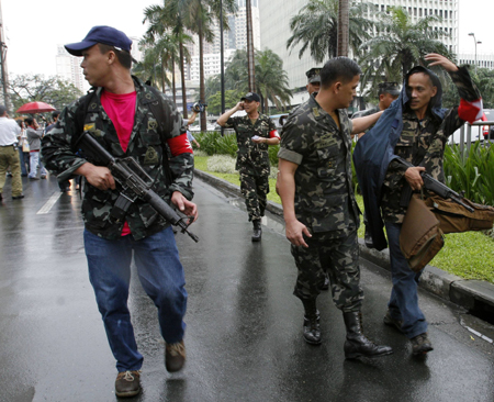 Armed soldiers walk down a street on their way to a luxury hotel in Makati City, metro Manila, November 29, 2007. [Agencies]