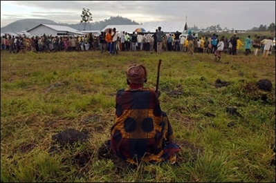 A displaced person watches crowds gather for the visit of Antonio Guterres, the UN's refugee chief, to a camp in Buhimba, near Goma December 16, 2007. Guterres has deplored a humanitarian "tragedy" in eastern Democratic Republic of Congo, scene of misery and months-long fighting between Congolese troops and insurgents. [Agencies]