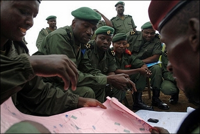 Congolese military commanders talk over a map, 07 December 2007, in Mushake, 40kms west of Goma. Troops loyal to a renegade former general retreated from hills ringing a key town in the Democratic Republic of Congo's conflict-torn east on Saturday after occupying them for four days, the UN said. [Agencies]