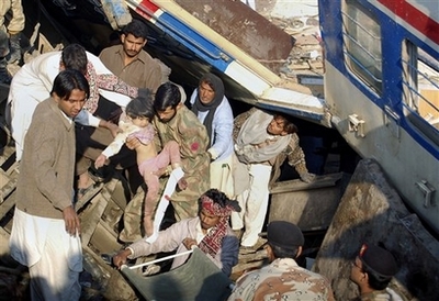 The train was speeding from Karachi toward Lahore when about 12 of its 16 carriages came off the rails near Mehrabpur, about 250 miles north of Karachi. It was unclear what caused the accident, which left hundreds of terrified survivors to claw their way out of the mangled wreckage in total darkness. By midmorning, rescuers had brought 56 bodies to three nearby hospitals, said Mumtaz Ali, an official from the Edhi Foundation, Pakistan's largest privately run emergency service. Col. Abbas Malik, an army doctor, said about 150 people were injured. Shahid Khan, a 25-year-old who had been traveling to Lahore with six of his relatives, said he used the light from his mobile phone to find his way out. "The train was going at full speed. Then there was a sudden jerk and we felt the train sinking into the earth. There was chaos everywhere," said Khan, sitting next to bundles of luggage he had salvaged from a carriage lying on its side in the field. Army engineers used two cranes and cutting equipment to free the last survivors, including a girl about 3 years old with a bloodied left foot, from one of the badly damaged carriages, many of which were thrown down an embankment into a waterlogged field. Dozens of soldiers and police helped tend the injured and carry them away to waiting ambulances, as hundreds of people from the surrounding villages looked on. The train, which derailed at about 2 am, was loaded with an estimated 900 passengers, many of them heading home for the Islamic holiday of Eid ul-Adha. Mohammed Khalid, a railway official who was traveling in one of the rear wagons that stayed on the rails, said he suspected a problem with the track -- possibly sabotage -- caused the accident. "My guess is that there was some piece of rail was missing and the engine jumped the missing track and the following wagon got stuck," he said. After the crash, a section of one of the rails had been torn loose. The engine came to a halt about a mile further up the line. In another case, a speeding train struck a crowded bus at a railway crossing near Lahore in October, killing 12 people and injuring about 50 others. About 130 people died in July 2005 when three trains collided in southern Pakistan. |