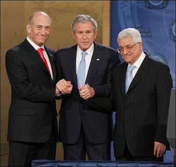 President George W. Bush stands on stage with Israel's Prime Minister Ehud Olmert and Palestinian President Mahmoud Abbas at the Israel-Palestinian Peace Conference at the US Naval Academy in Annapolis, Nov. 27, 2007. [Xinhua]