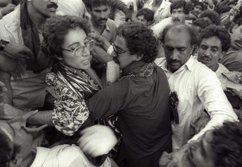 A supporter restrains Benazir Bhutto (L) after she lost her temper and pulled the hair of a man and slapped him in a crowd that almost crushed her during a rally on her return from exile in Europe, in Lahore in this April 10, 1986 file photo. [Agencies]