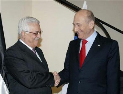 Palestinian President Mahmoud Abbas (L) and Israel's Prime Minister Ehud Olmert shake hands during their meeting in Jerusalem Dec. 27, 2007. [Xinhua]