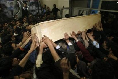 Pentagon officials said Friday they have seen nothing to give them any worries about the security of Pakistan's nuclear arsenal. While many grieving Pakistanis turned to violence, hundreds of thousands paid their last respects to the popular opposition leader as she was placed beside her father in a marble mausoleum in the Bhutto ancestral village in southern Sindh province. "I don't know what will happen to the country now," said mourner Nazakat Soomro, 32. The government said it would hunt down those responsible for her death in the tribal areas along the Afghan border. "They will definitely be brought to justice," Interior Ministry spokesman Javed Iqbal Cheema said. The government released a transcript Friday of a purported conversation between militant leader Baitullah Mehsud and another militant. "It was a spectacular job. They were very brave boys who killed her," Mehsud said, according to the transcript. The government did not release an audiotape. Cheema described Mehsud as an al-Qaida leader who was also behind most other recent terror attacks in Pakistan, including the Karachi bomb blast in October against Bhutto that killed more than 140 people. Mehsud is thought to be the commander of pro-Taliban forces in the tribal region of South Waziristan, where al-Qaida fighters are also active. In the transcript, Mehsud gives his location as Makin, a town in South Waziristan. This fall, he was quoted in a Pakistani newspaper as saying that he would welcome Bhutto's return from exile with suicide bombers. Mehsud later denied that in statements to local television and newspaper reporters. Cheema announced the formation of two inquiries into Bhutto's death, one to be carried out by a high court judge and another by security forces. Bhutto was assassinated Thursday evening after a rally in the garrison city of Rawalpindi near Islamabad. Twenty other people also died in the attack. On Thursday, authorities had said Bhutto died from bullet wounds fired by a young man who then blew himself up. A surgeon who treated her, however, said Friday she died from the impact of shrapnel on her skull. But later Friday, Cheema said those two accounts were mistaken. He said all three shots missed her as she greeted supporters through the sunroof of her vehicle, which was bulletproof and bombproof. He also denied that shrapnel caused her death, saying Bhutto was killed when she tried to duck back into the vehicle, and that the shock waves from the blast knocked her head into a lever attached to the sunroof, fracturing her skull. The government released a photograph showing blood on the lever. |