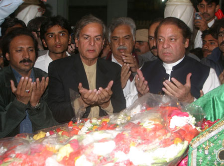 Updated: 2007-12-30 09:52 Islamabad - The chief of Pakistan Muslim League-Nawaz (PML-N), Mian Nawaz Sharif, visited the home town of former Prime Minister Benazir Bhutto to condole her death on Saturday. Leading a 40-member delegation, Sharif visited Bhutto's grave at Garhi Khuda Bakhsh in the southern Sindh province, said the report. Bhutto was killed in a suicide attack on Thursday after addressing an election rally in the garrison city of Rawalpindi. The suicide bomber launched the attack when Bhutto was leaving the venue of the public meeting. PML-N spokesman Siddiqul Farooq said that Sharif's delegation was aimed at showing unity with the people of Sindh. Sharif has already announced boycott of the Jan. 8 general elections as protest against the assassination of Bhutto. Bhutto's son Bilawal is expected to announce the "will" of his mother about the future of Pakistan People's Party (PPP) including the new leader on Sunday when the leaders of the PPP will meet to decide whether or not to take part in the general elections. |