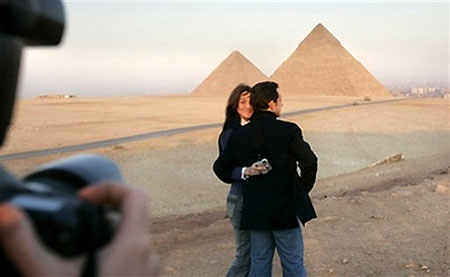 French President Nicolas Sarkozy and his new girlfriend - supermodel-turned singer Carla Bruni (L), looking back at photographers, admire a view of the Giza Pyramids at sunset in Cairo, Egypt Sunday, Dec. 30, 2007. Sarkozy is vacationing in Egypt with his girlfriend but also met Sunday with Egyptian President Hosni Mubarak. [Agencies]