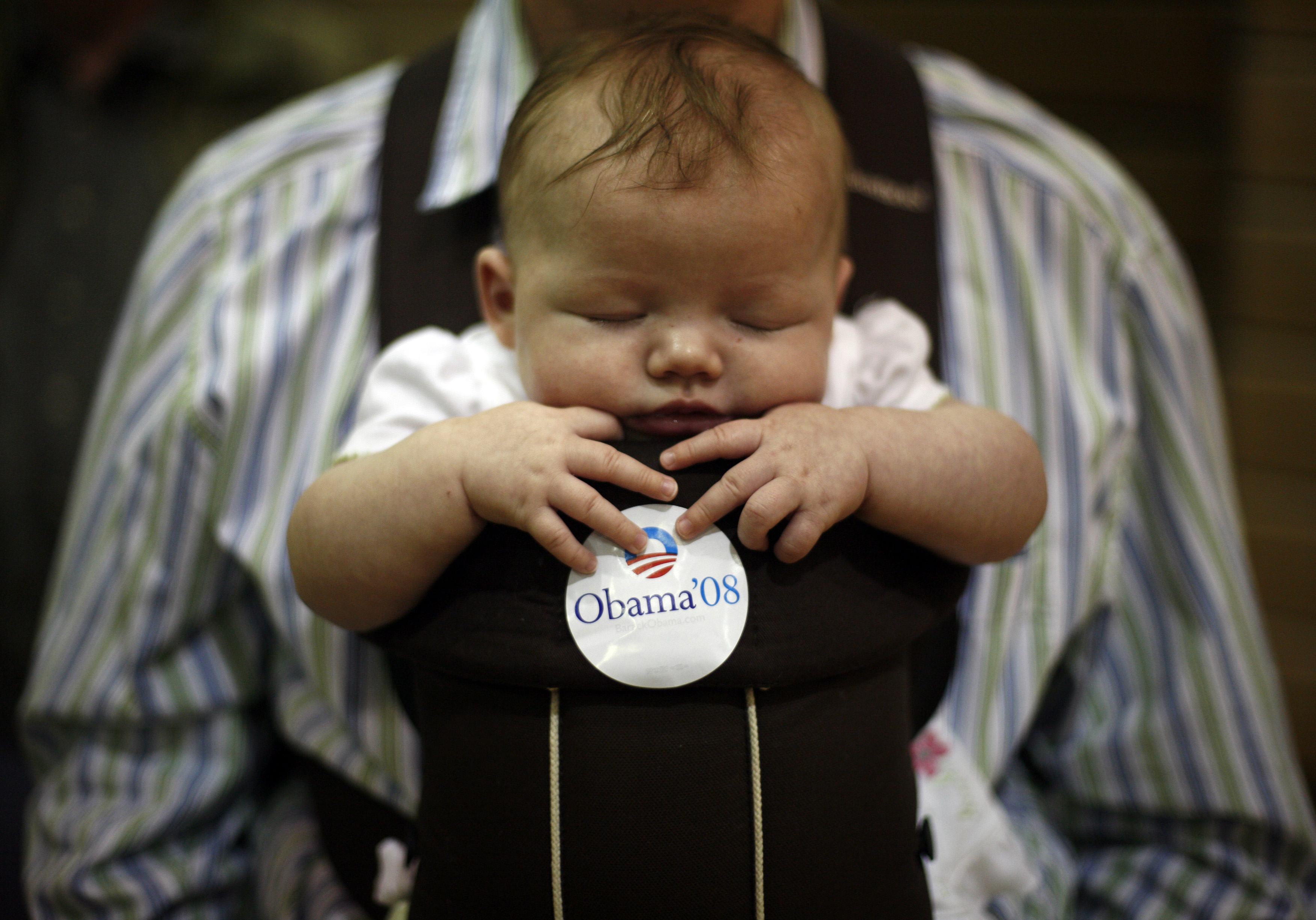 | Avary Hunsinger sleeps on the chest of her father Andy Hunsinger as U.S. Democratic presidential candidate Senator Barack Obama (D-IL) speaks during a campaign stop in Newton, Iowa December 30, 2007. [Agencies] |