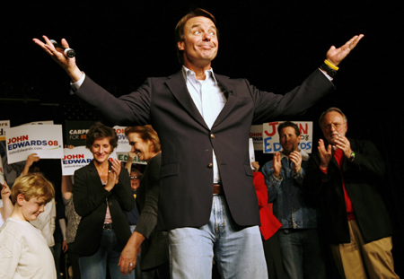 US Democratic Presidential candidate and former Senator John Edwards (D-NC) campaigns as his wife Elizabeth (3rd L) reaches for their son Jack (L) in West Des Moines, Iowa, January 2, 2008. [Agencies]