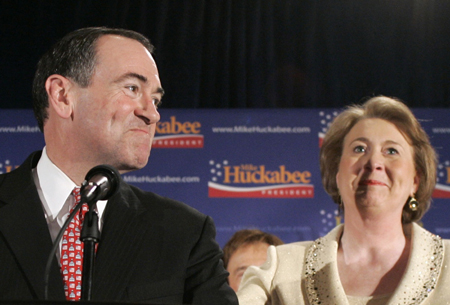 Republican presidential candidate and former Arkansas Governor Mike Huckabee and his wife Ann celebrate his victory in the 2008 Republican Iowa caucus at a rally in Des Moines, Iowa January 3, 2008. [Agencies]
