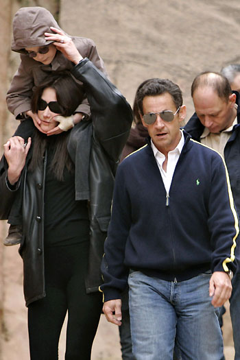 French President Nicolas Sarkozy (R), his girlfriend Carla Bruni and her son visit the ancient Jordanian ruins of Petra January 5, 2008. [Agencies]