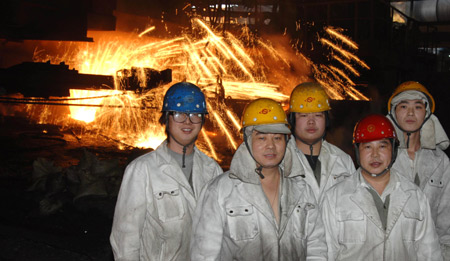 Beijing Shougang Group workers pose in front of the No. 4 blast furnace to be extinguished January 2, 2008. Shougang, one of China's leading steel manufacturers and also the city's major polluter, extinguished the fire in one of its four blast furnaces on Saturday, as part of its pledge to cut its normal output by half during the Olympics. [Xinhua]