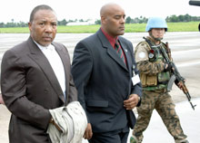 Former Liberian President Charles Taylor (L) wears body armour and handcuffs covered by clothing as he arrives at the airport in Freetown Sierra Leone, in this June 20, 2006 file photo. [Xinhua]