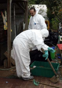 Israeli workers wearing protective gear stand beside a cage outside a kindergarten in the Israeli town of Binyamina January 3, 2008. Israeli officials said on Thursday the deadly bird flu strain H5N1 had been found in dead chickens from a kindergarten petting zoo. "The H5N1 bird flu strain has been found in the fowl," the Agriculture Ministry said in a statement, referring to 18 dead chickens found in the kindergarten. [Agencies]