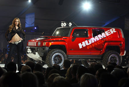 A model walks the runway in front of a Hummer vehicle during the GM Style event at the 2008 North American International Auto Show in Detroit, January 12, 2008. [Agencies]