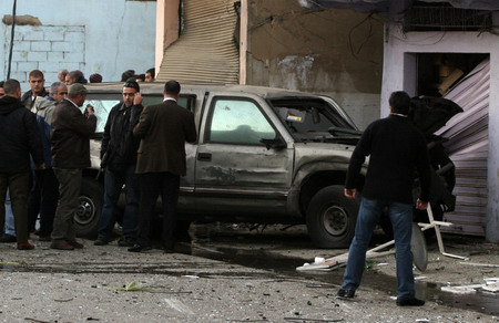 Lebanese officials and policemen inspect a U.S embassy vehicle after an explosion in a suburb north of Beirut January 15, 2008. At least three people were killed in an explosion in Beirut on Tuesday which wounded a passenger in a diplomatic car, security sources said, and Lebanon's LBC television channel said a US embassy car was hit. [Agencies]