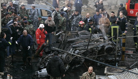 Lebanese soldiers and police secure the site of an explosion in a suburb north of Beirut January 15, 2008. At least three people were killed in an explosion in Beirut on Tuesday which wounded a passenger in a diplomatic car, security sources said, and Lebanon's LBC television channel said a US embassy car was hit. [Agencies]