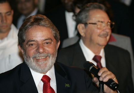 Brazil's President Luiz Inacio Lula da Silva (L) talks to the media as Cuba's acting President Raul Castro stands in the back during Lula's departure from Havana's Jose Marti airport January 15, 2008. Lula met with Cuba's leader Fidel Castro on Tuesday and said that Castro is lucid and healthy enough to resume a political role in Cuba. [Agencies]