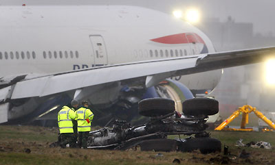 LONDON - Investigators said on Friday that the engines of a British Airways Boeing 777 failed to respond to demands for more thrust shortly before it crash-landed at London's Heathrow Airport on Thursday. Thirteen people were injured when BA flight 83 from Beijing came down well short of the southern runway and the 136 passengers were evacuated down the aircraft's emergency chutes as fire crews doused the plane with foam. Giving details of its initial investigation, the Air Accidents Investigations Branch (AAIB) said: "At approximately 600 ft and two miles from touch down, the Autothrottle demanded an increase in thrust from the two engines but the engines did not respond." "Following further demands for increased thrust from the Autothrottle, and subsequently the flight crew moving the throttle levers, the engines similarly failed to respond." The AAIB said the flight had been normal until the plane made its final approach for landing. It said 13 people had been injured, one passenger seriously. It said the investigation would now focus on a more detailed analysis of information from the flight recorder and other recorded data, and examination of "the range of aircraft systems" that could affect the engines. Captain Peter Burkill, given a rousing reception by staff at the airline's headquarters, declined in a brief statement to reporters to make any comment on the cause of the crash. But he praised his crew for demonstrating "the highest standards of skill and professionalism," thanked the passengers for "their calmness and good sense" and praised the emergency services for reacting so speedily. He said it was his co-pilot, John Coward, who had been at the controls during the difficult last minutes of the flight. SPECIALISTS ARRIVE A team of specialists from Boeing arrived to join air accident investigators and experts from Rolls Royce, who are expected to take several months to find the cause of the crash. The aircraft was powered by two two Rolls-Royce RB211 Trent 895-17 turbofan engines. Heathrow, the world's busiest international airport, was struggling to return to normal. More than 50 flights were cancelled on Friday morning, but British Airways said it planned to operate all its long haul flights and up to 90 percent of short haul departures. Prime Minister Gordon Brown, whose flight to China to promote business ties was delayed by the accident, praised the crew of the airliner. "I think it's right to pay tribute to the calmness and professionalism of the BA staff and the captain, and what he achieved in landing the plane," Brown told reporters shortly after his arrival in the Chinese capital, Beijing. Part of the plane's undercarriage, which parted from the fuselage when the aircraft hit the ground, lay in the grass several hundred metres (yards) from the runway. |