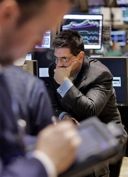 Specialist Richard Wey, right, watches his monitor on the floor of the New York Stock Exchange Wednesday Jan. 23, 2008. Stocks fell in another rocky opening Wednesday, with investors uneasy about the health of the economy and corporate earnings after disappointing reports from big names like Apple Inc. and Motorola Inc. [Agencies]
