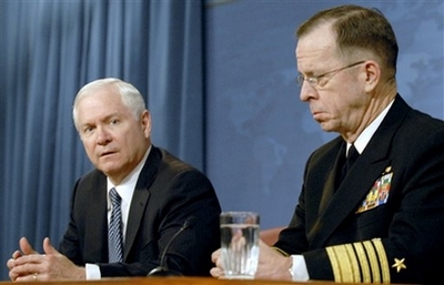 Secretary of Defense Robert Gates, left. and the Chairman of the Joint Chiefs of Staff, Adm. Michael Mullin, talk with reporters at the Pentagon in Washington Thursday, Jan. 24, 2008. [Agencies]