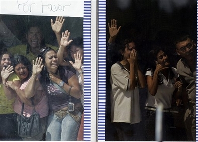 The gunmen first let three hostages go and then negotiated with police while holding on to the last two, Guarico state Gov. Eduardo Manuitt said. "This nightmare is over," Manuitt told state television. They eventually turned over their guns and a grenade, and then were ordered to the ground as police arrested them, Manuitt said. The pursuit ended less than two hours after the gunmen fled the bank in the ambulance under a deal negotiated with police. The standoff in this town southeast of Caracas began Monday morning with a botched robbery. In the final hours, some hostages inside the bank waved signs in the windows with desperate pleas for help and used cell phones to call their relatives. Under the deal with police, the gunmen were permitted to leave with five hostages who agreed to accompany them, freeing the rest of the captives at the bank. One of the hostages who later left with the gunmen, Vanessa Saavedra, spoke quietly and haltingly to Colombia's Caracol Radio by cell phone from inside the bank, saying: "We don't want them to shoot ... We don't want them to open fire. Please." Saavedra's mother, Jasmin Gonzalez, said her daughter - a 25-year-old teller - volunteered to go. "She's very brave. I know she's going to come out of this fine," Gonzalez said through tears outside the bank. It was not immediately known how many hostages were freed as relatives and onlookers massed at the front door of the bank and some were led to waiting ambulances. Bank executive Leon Enrique Cottin said earlier Tuesday that 33 hostages were held captive, but Manuitt said before the siege ended that some 50 hostages were being freed. Those freed were believed to include a 2-week-old infant, at least three other children under the age of 10, and a woman who is eight months pregnant. She was wheeled out reclining on a stretcher. One man emerged with a bandaged hand, carrying a girl in his arms, and got into an ambulance. "After five or six hours, they began to let down their guard saying, 'You aren't going to die,'" freed hostage Juan Carlos Gil told The Associated Press of his captors. "They were nervous, but it was all an atmosphere as if they were everyone's friends." His account differed from that of Justice Minister Ramon Rodriguez Chacin, who said during the standoff that the gunmen had been taking drugs, making the situation particularly volatile. Gil said he never saw any of the gunmen use drugs and they appeared sober. The four gunmen entered a branch of Banco Provincial on Monday morning when a uniformed police officer pulled up to use the cash machine and surprised the would-be robbers, said Amanda Saldivia, a reporter for the local Guarana Radio FM. Seven captives made it out of the bank during the standoff, including several who were released and two who fled. Saavedra said she was terrified when the men pointed a gun at a security guard and threatened him. "He went out running and they shot at him" but missed, Saavedra told Caracol. "It was truly horrific." A man identified as one of the gunmen who gave his name as Jorge spoke to Caracol during the standoff, saying "people have the sense that we're going to leave." Shortly before the deal was reached, one of the hostages broke a window in desperation, and one of the gunmen fired a shot in response, Manuitt said. Officials did not immediately say if the gunmen left with any money. Police officers with assault rifles took up positions at windows directly above the bank during the standoff, and then stood down at the urging of a hostage as the ambulance pulled up to ferry the group away. Security cameras captured images of the gunmen until the cameras went dead - apparently cut off by the men and the footage was turned over to authorities, said Cottin, the Venezuela president of Spain's Bilbao Vizcaya Argentaria, or BBVA, which owns Banco Provincial. As for the gunmen, Manuitt told state television, "We think they don't have much experience because of the sort of weapons they carry and by their behavior." He said they carried handguns and "a type of grenade." |
