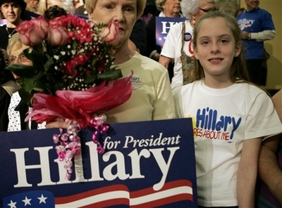 Isabelle Craford-Finn, 9, right, waits with her grandmother Maxine Graybill, left, for the arrival of Democratic presidential hopeful Sen. Hillary Rodham Clinton, D-N.Y., in Davie, Florida, January 29, 2008. [Agencies]