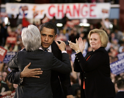 US Democratic presidential candidate Barack Obama hugs Kansas Governor Kathleen Sebelius as US Senator Claire McCaskill (D-MO) watches on during a rally in Kansas City, Missouri, January 29, 2008. [Agencies]