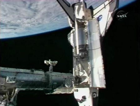 NASA said the link-up went smoothly but it was studying a small tear in a thermal blanket on the shuttle that may have occurred during take-off.