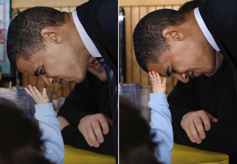 Eleven-month-old Eric Hansen touches the face of U.S. Democratic presidential candidate Senator Barack Obama (D-IL) during a visit to Nicky's Cruisin Diner in Bangor, Maine in this February 9, 2008 combination photograph. [Agencies]