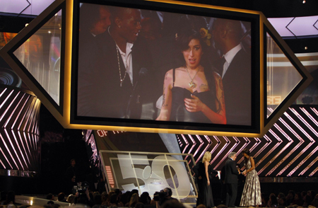 Updated: 2008-02-11 14:22 LOS ANGELES - British singer/songwriter Amy Winehouse won the Grammy for record of the year on Sunday, extending her sweep to five statuettes. The 24-year-old artist, whose promising career has been derailed by drug and legal problems, was honored for the autobiographical hit song "Rehab," in which she recounts her reluctance to seek help for excessive drinking. She accepted the award from a London venue where she had just performed both "Rehab" and the equally personal tune "You Know I'm No Good." She was unable to attend the Los Angeles event because she is undergoing treatment for her addictions. Winehouse thanked "my Blake incarcerated," referring to her husband Blake Fielder-Civil, who is in a London prison facing serious charges in connection with a pub brawl. She also dedicated the award to her London hometown, "'cos Camden town is burning down." Camden market, one of the British capital's most popular tourist districts, was devastated by a huge fire on Saturday. The area has long been one of Winehouse's favorite haunts. The other nominees were Beyonce's "Irreplaceable;" the Foo Fighters' "The Pretender;" Rihanna Featuring Jay-Z's "Umbrella;" and Justin Timberlake's "What Goes Around ... Comes Around." |