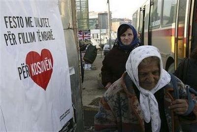 Kosovo women walk past a poster which reads: "Celebrate with Dignity. For a Good Start. For Kosovo", in Pristina February 15, 2008. [Agencies]