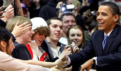 Democratic presidential hopeful Sen. Barack Obama, D-Ill., greets supporters after his address at a rally Monday, Feb. 18, 2008, in Beloit, Wisc. [Agencies]