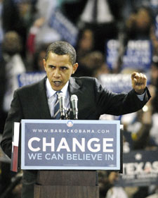 US Democratic presidential candidate Senator Barack Obama (D-IL) speaks to supporters during a campaign event in Houston February 19, 2008.  [Agencies]