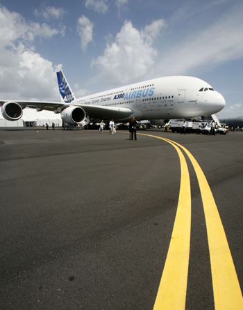 An Airbus A380 superjumbo sits at a display area before being towed to a runway at the Singapore Air Show February 20, 2008. [Agencies]