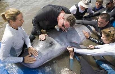 In this photo released by the Florida Keys News Bureau, marine mammal rescue volunteer Stacey Anderson, left, helps to calm a pygmy sperm whale, while Bob Coakley examines the mammal at the Marine Mammal Conservancy Sunday, Feb. 24, 2008, in Key Largo, Fla. The 10-foot-long male, estimated to weigh 1,000 pounds, was discovered stranded off the Florida Keys early Saturday, Feb. 23, and was subsequently transported to the Conservancy for care. [Agencies]