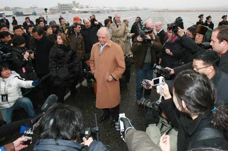 Lorin Maazel (C), music conductor of the New York Philharmonic, is circled by journalists after the New York Philharmonic's arrival at an airport in Pyongyang, capital of the Democratic People's Republic of Korea (DPRK), Feb. 25, 2008. The New York Philharmonic arrived here Monday and its concert slated for Tuesday will be the first by a US symphony orchestra in the DPRK. [Xinhua]