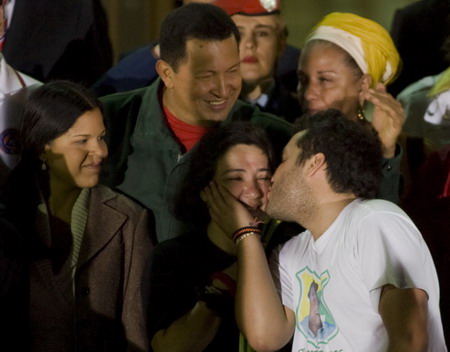 Jaime Lozada, son of Colombian lawmaker Gloria Polanco, gives his mother a kiss at Miraflores Palace in Caracas February 27, 2008. FARC rebels freed four lawmakers held hostage for years in Colombia's jungle on Wednesday, in a victory for Venezuelan President Hugo Chavez (back C) who brokered the deal. Venezuelan helicopters picked up Polanco, Luis Eladio Perez, Orlando Beltran and Jorge Gechem, who is believed to be suffering severe heart problems. [Agencies] To read the story