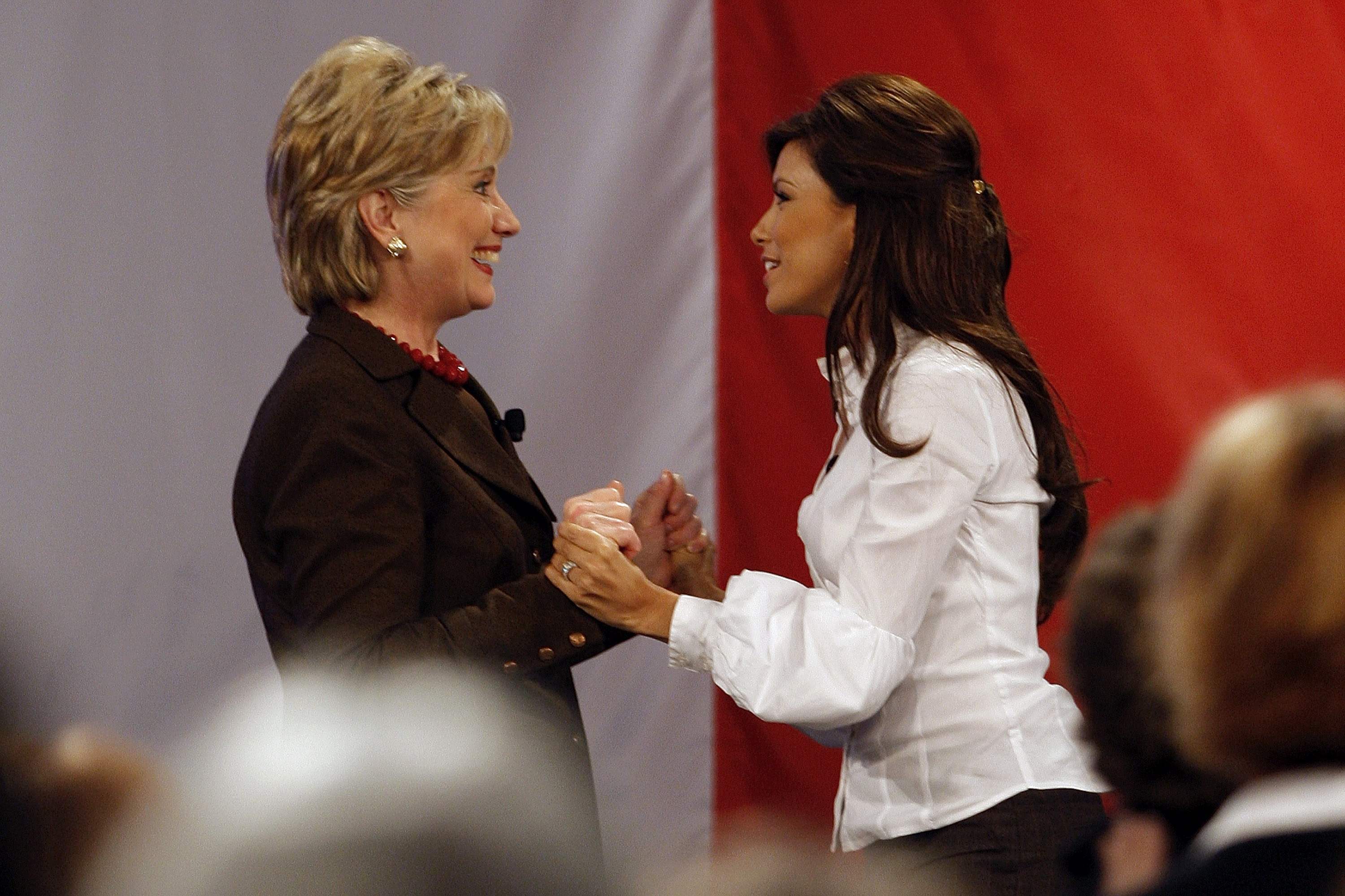 Democratic presidential candidate Senator Hillary Clinton (D-NY) (L) and Eva Longoria Parker (R) clasp hands at the conclusion of a  "Texas-Sized" Town Hall meeting in Austin, Texas March 3, 2008. [Agencies]