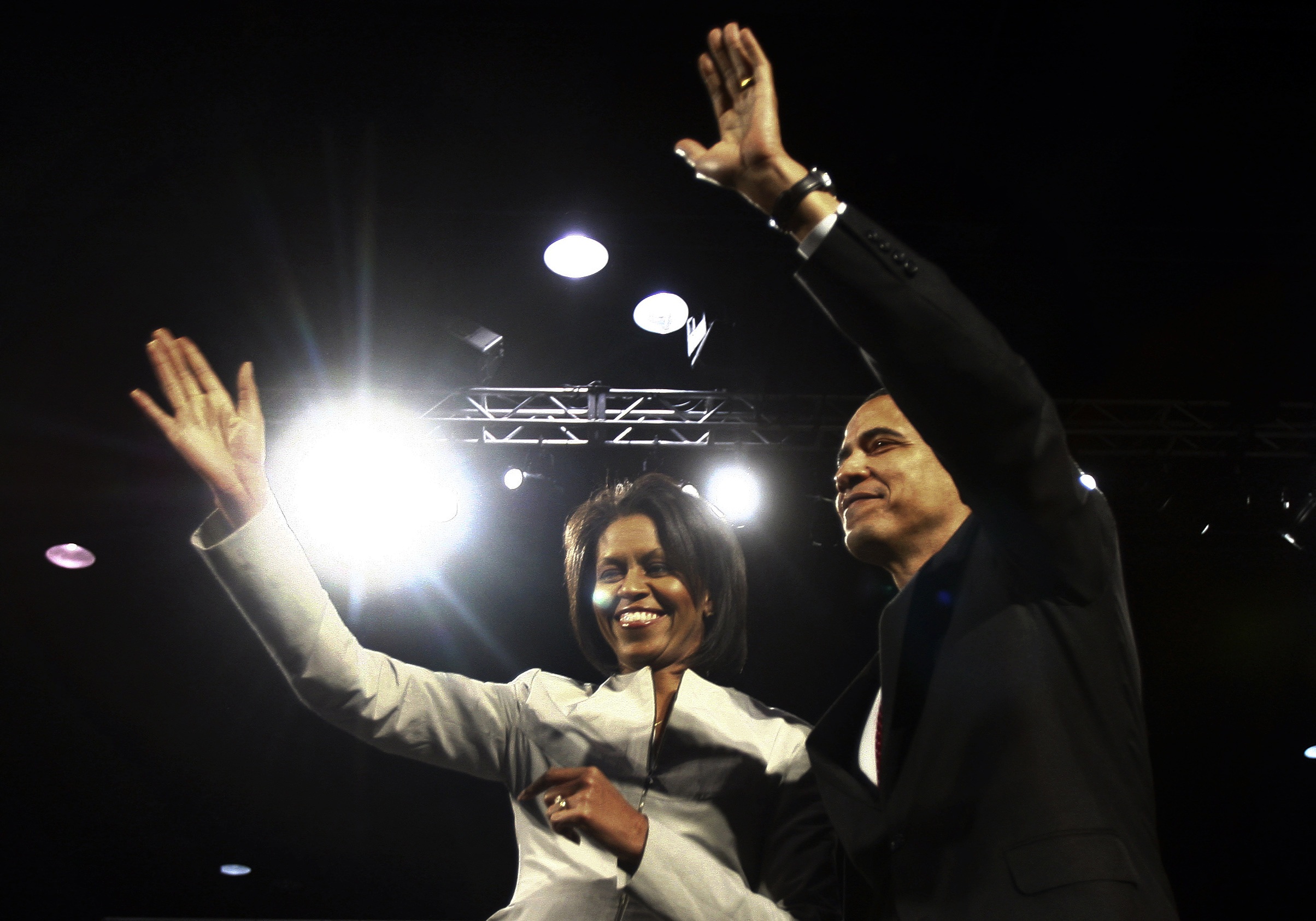 | US Democratic presidential candidate Senator Barack Obama (D-IL) and his wife Michelle wave at a campaign rally at the George R. Brown Convention Center in Houston, Texas, March 3, 2008. [Agencies] |