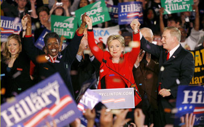 US Democratic presidential candidate Senator Hillary Clinton (D-NY) (C) celebrates with supporters at her Ohio primary election night rally in Columbus, Ohio March 4, 2008. At left is her daughter, Chelsea Clinton. [Agencies]