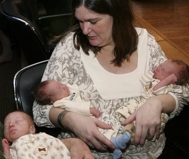Allison Penn looks at her identical triplets, from left, Logan, Eli and Collin, Tuesday, March 4, 2008, at North Shore University Hospital in Manhasset, N.Y. [Agencies]