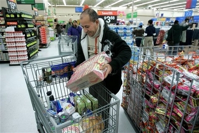 Mohammed Alsabahi stocks up on Ramen noodles at the recently opened Wal-Mart in Dearborn, Mich., Thursday, March 6, 2008. The nation's retailers got a little reprieve in February, as consumers hesitantly returned to malls and stores after retrenching in recent months.[Agencies]
