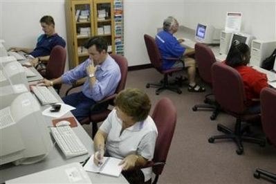 Visitors search for job possibilities on the Internet at Workforce Central Florida in Casselberry, Florida July 3, 2003. U.S. employers cut payrolls for a second straight month during February, slashing 63,000 jobs for the biggest monthly decline in nearly five years as the nation's labor markets weakened steadily, a government report on Friday showed. [Agencies]